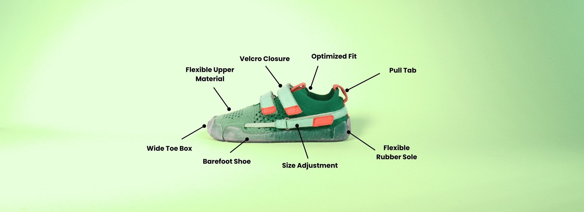 The shoe is primarily adjustable in length, as children’s feet grow most in that direction. Of course, feet also grow wider, but studies show that width growth is significantly less pronounced than length growth. Thanks to the naturally wide toe box, the flexible upper material, and the size-adjustment system that involves the entire toe box, growing feet still have plenty of room. Children with higher or lower insteps can also adjust the shoe individually using the Velcro straps on the upper.